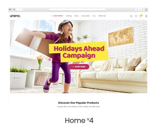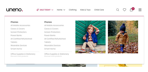 We’ve built Uneno with 5 different header styles and a dedicated header for mobile. The header consists of well-structured navigation, search bar, header icons for quick access to important pages as well as your brand logo. We’ve also built a dedicated mobile header so that your website when viewed on mobile looks just like an app.